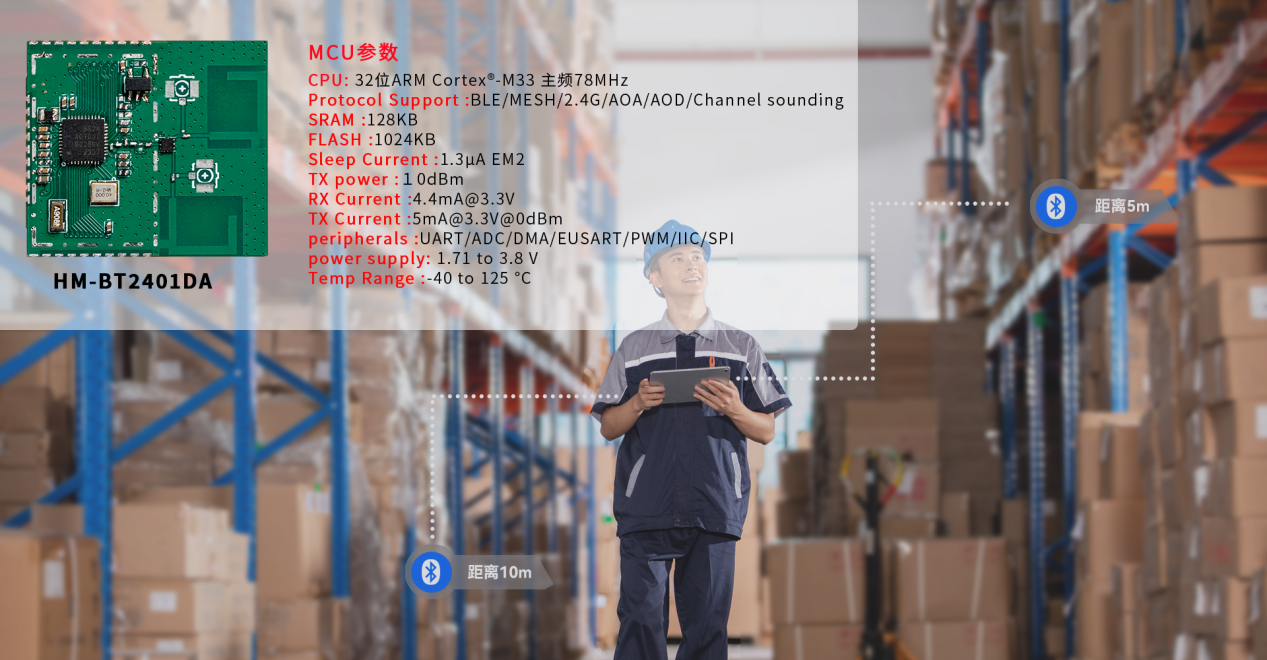 在信道探测能力方面,经多次实测,在PBR(Path-Based Ranging)模式下,10米范围内,HM-BT2401DA已可实现50cm左右的定位精度,可被广泛应用于室内环境中的仓库管理、物品追踪与宠物追踪等领域。