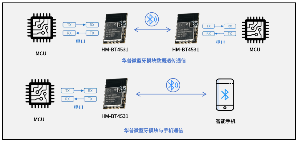 用户主控MCU可以通过模块的串口和移动设备进行双向通讯,用户也可以通过特定的接口指令,对某些通讯参数进行管理控制。