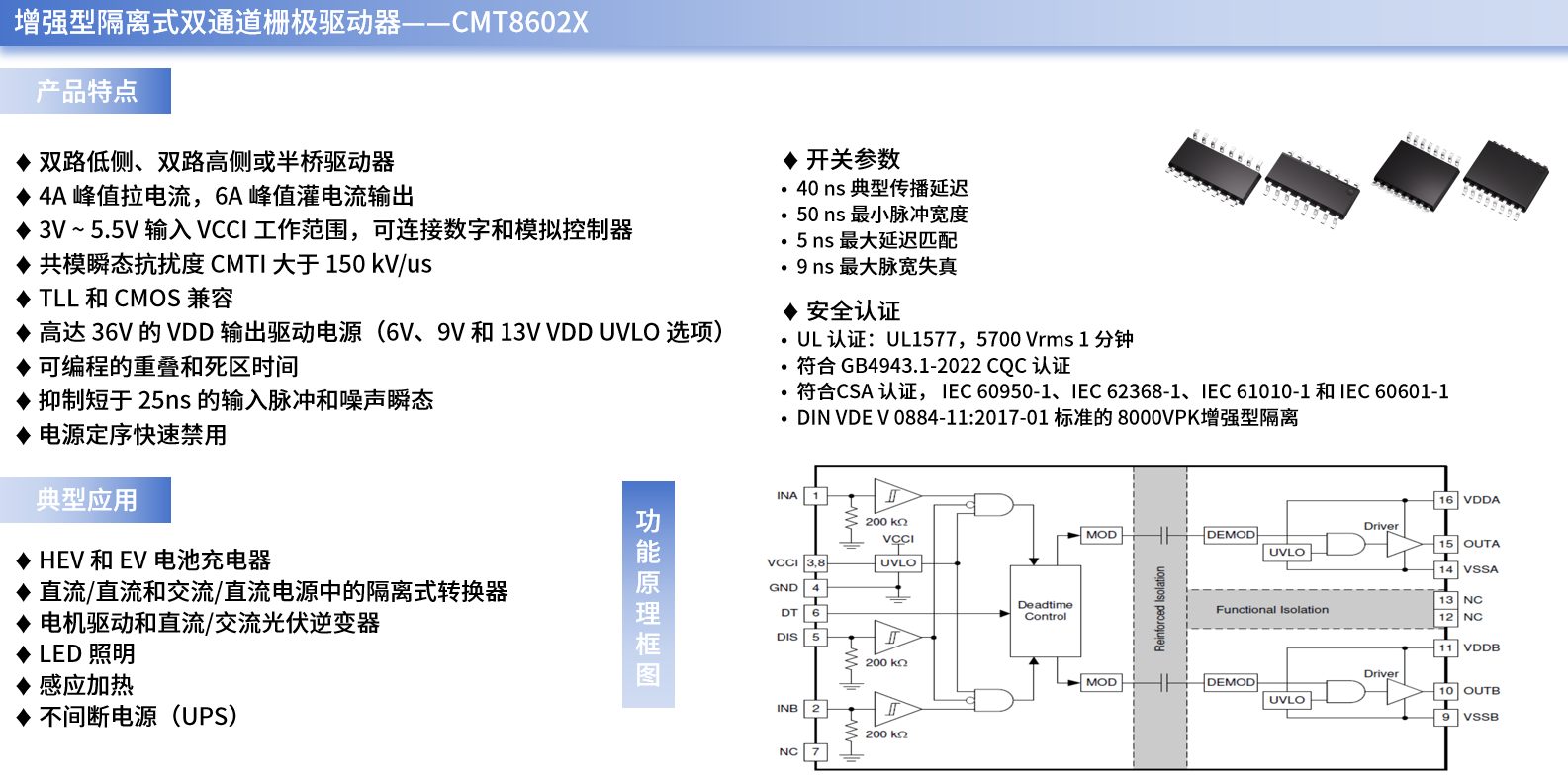 CMT8602X的输入侧通过一个5700 Vrms增强型隔离层与两个输出驱动器隔离,共模瞬态抗扰度(CMTI)的最小值为150 kV/us。 两个二次侧驱动器之间采用内部功能隔离,可支持高达1500VDC的工作电压。