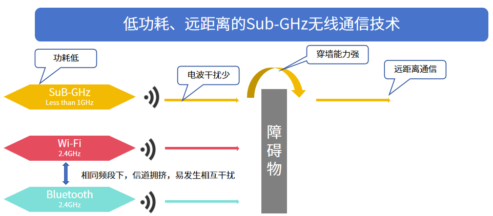 Sub-GHz与工作在2.4GHz频段的Wi-Fi、蓝牙等无线通信技术相比,可实现更低的运行功耗、更远的传输距离、更多的设备接入节点和更为稳定的通信质量,尤其适合应用在低数据速率、通信频次低且依靠电池供电的物联网设备之中。